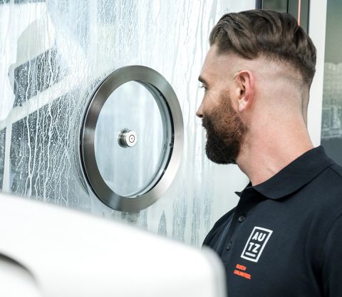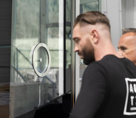 Weniger ist mehr: Unser rotierendes Sichtfenster ist bewusst so zurückhaltend gestaltet, dass es sich perfekt in die Front der jeweiligen Maschine einfügt – und damit die Gesamtästhetik bereichert.